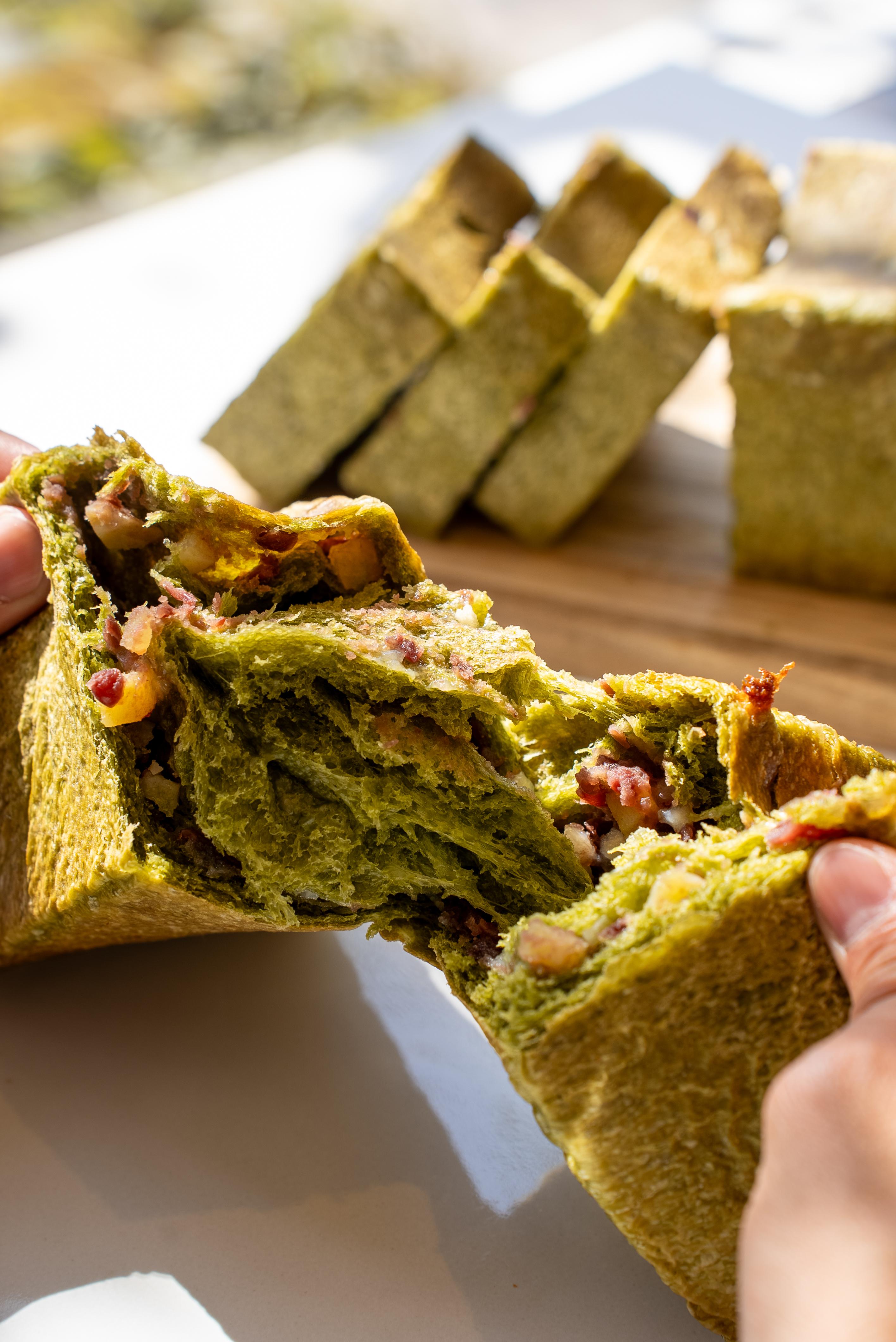 長時間低温熟成させた抹茶マナレイア生地に、望月さんの美味しい粒あん、紅はるか(さつまいも)、ホワイトチョコを巻きこんでいます。