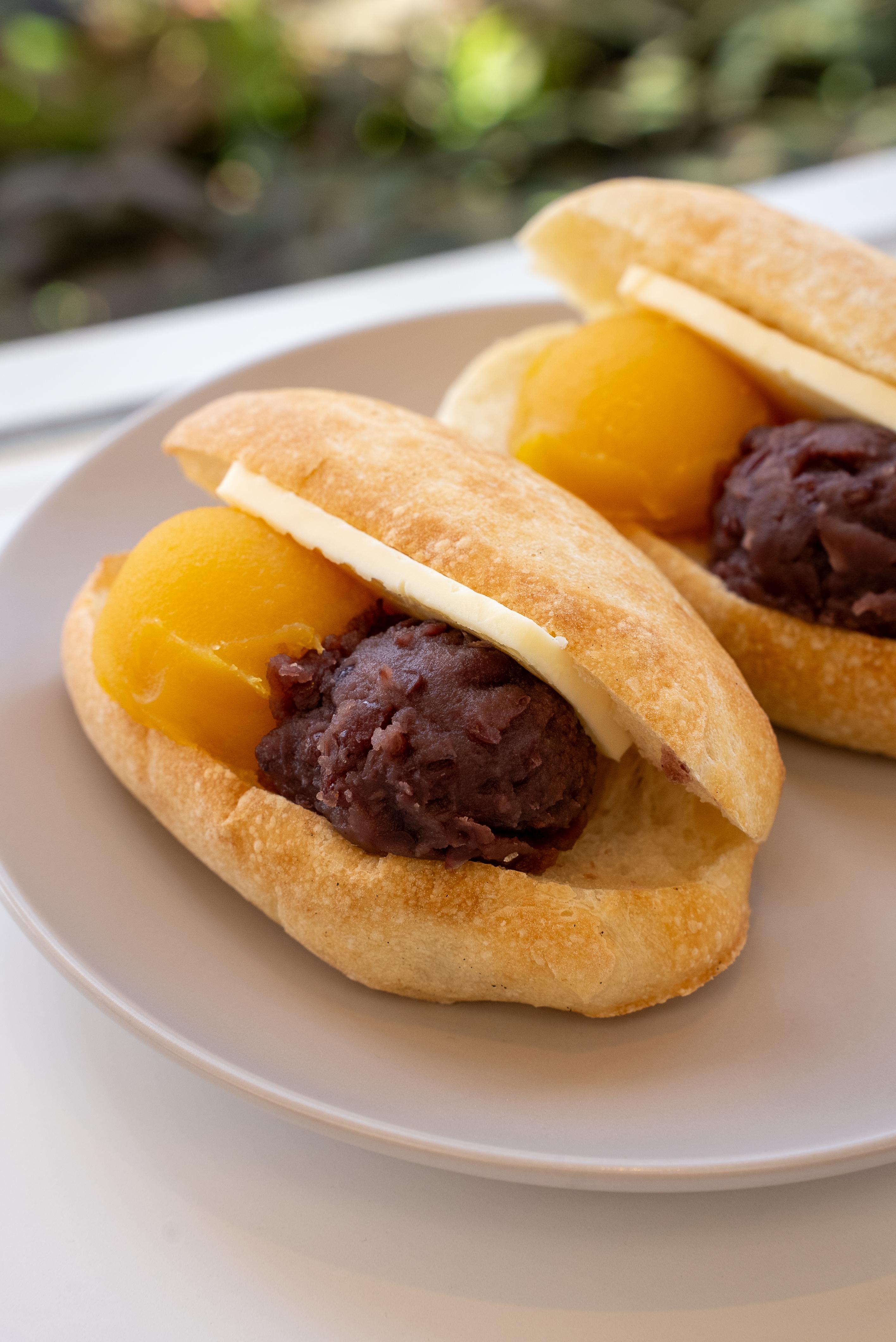 兵庫県産小麦を使用したチャバタに、望月さんの粒あん、いもあん、バターをサンドしました。