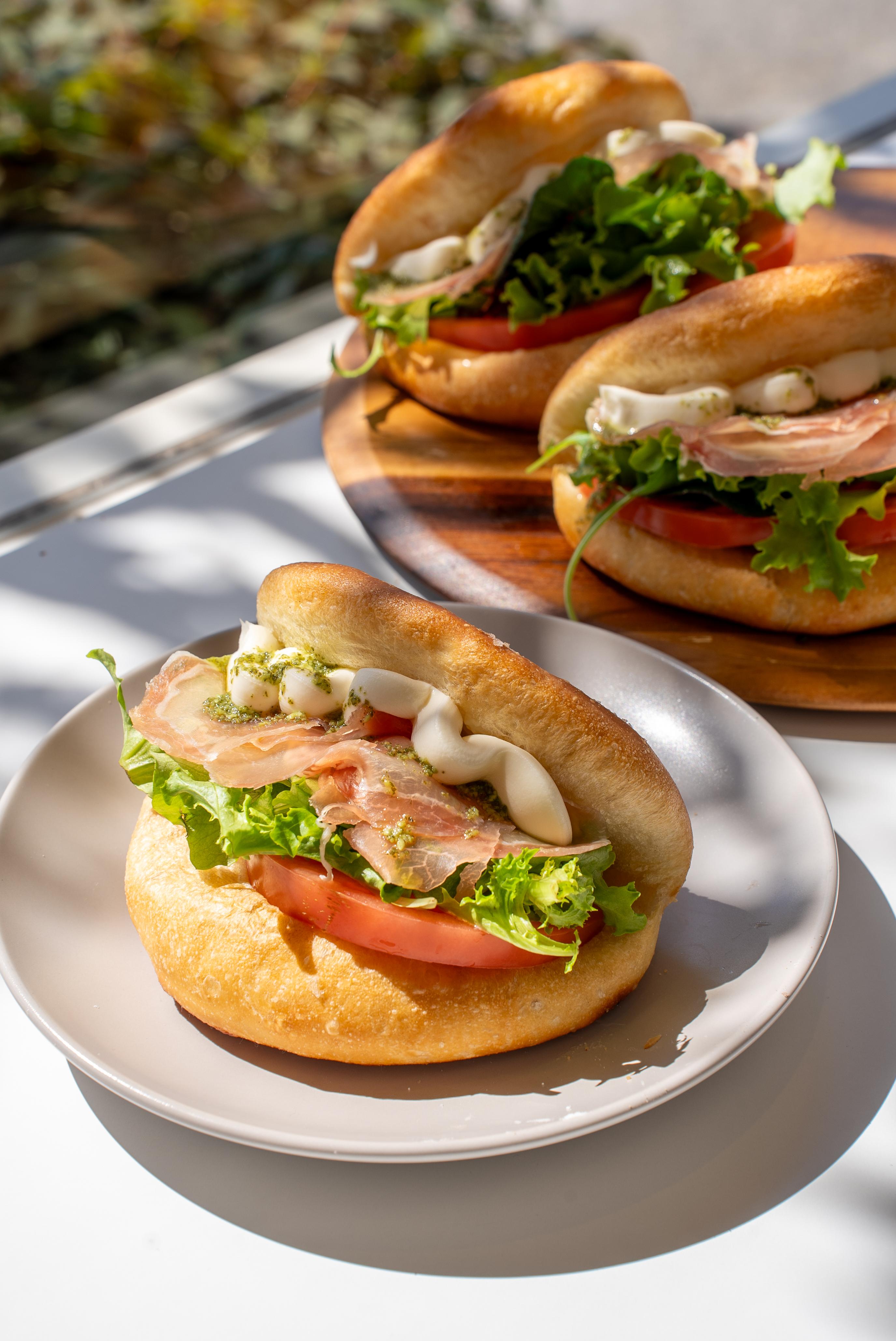 滋賀県産小麦”萬燈”を使用したフォカッチャに、田中さんのトマト、生ハム、キリチーズ、ジェノベーゼソースをサンドしました。