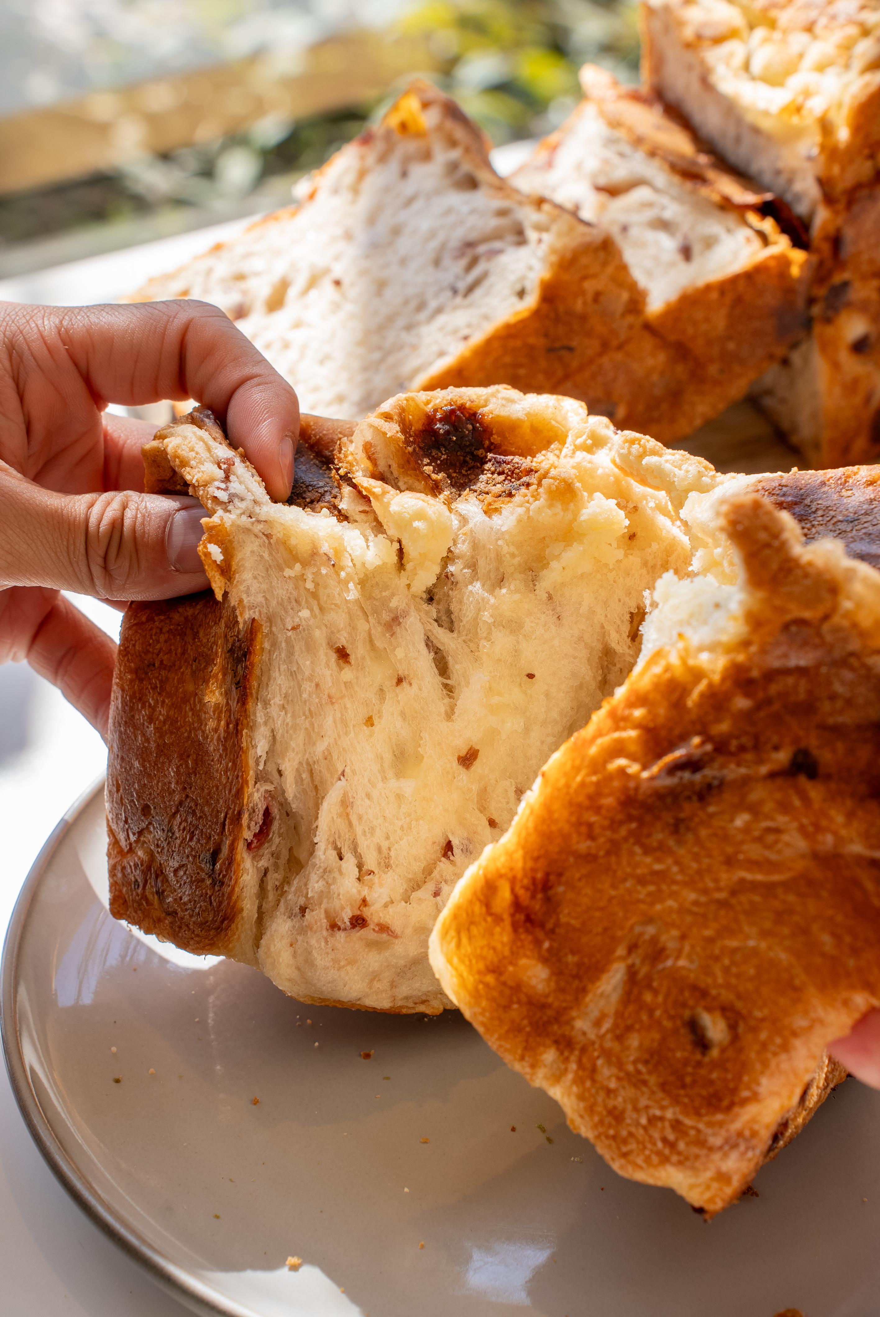 低温熟成させたマナレイア食パンに、クランベリー、ホワイトチョコを混ぜこんでいます。クランベリーの程よい酸味とホワイトチョコのコクが美味しい‼