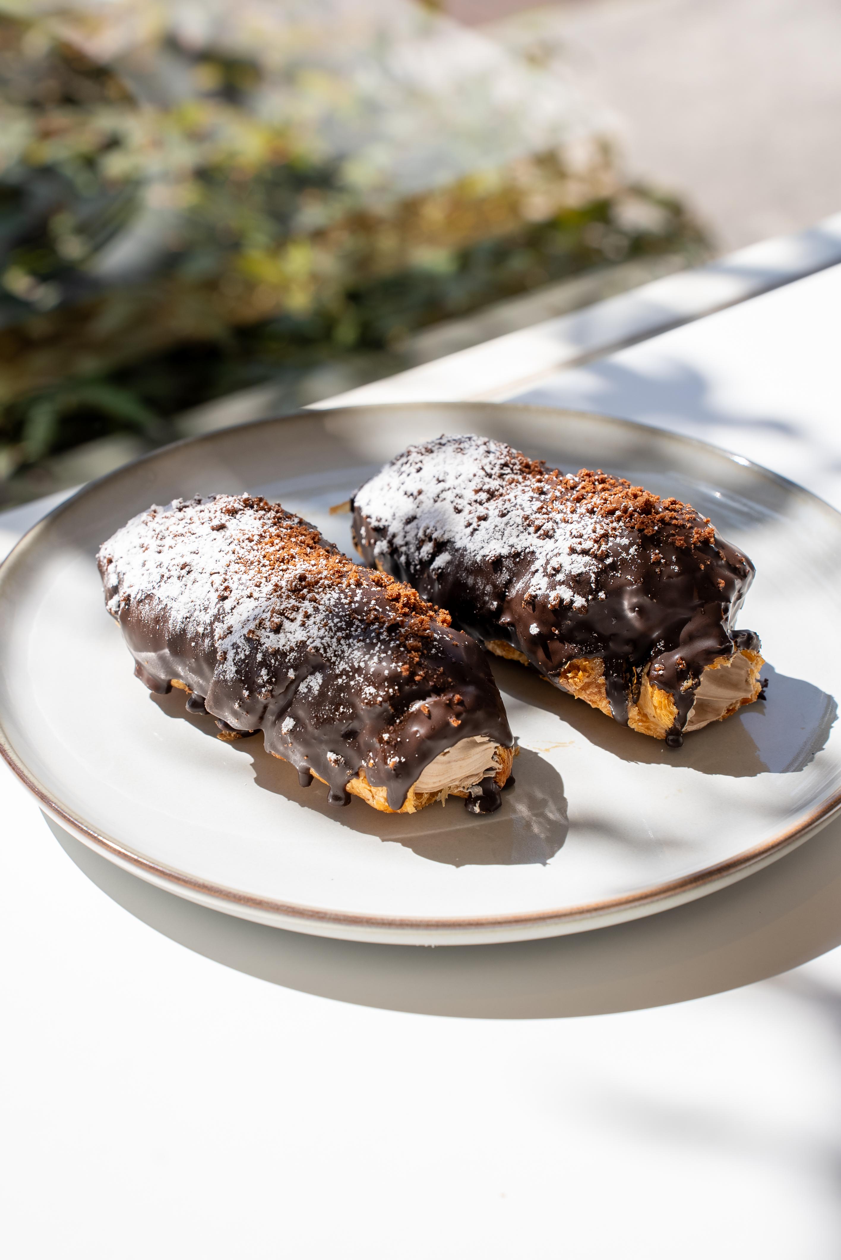 王様のチョコカスタード、チョコクリームをしぼり、福嶋さんの完熟いちごをトッピングしました。