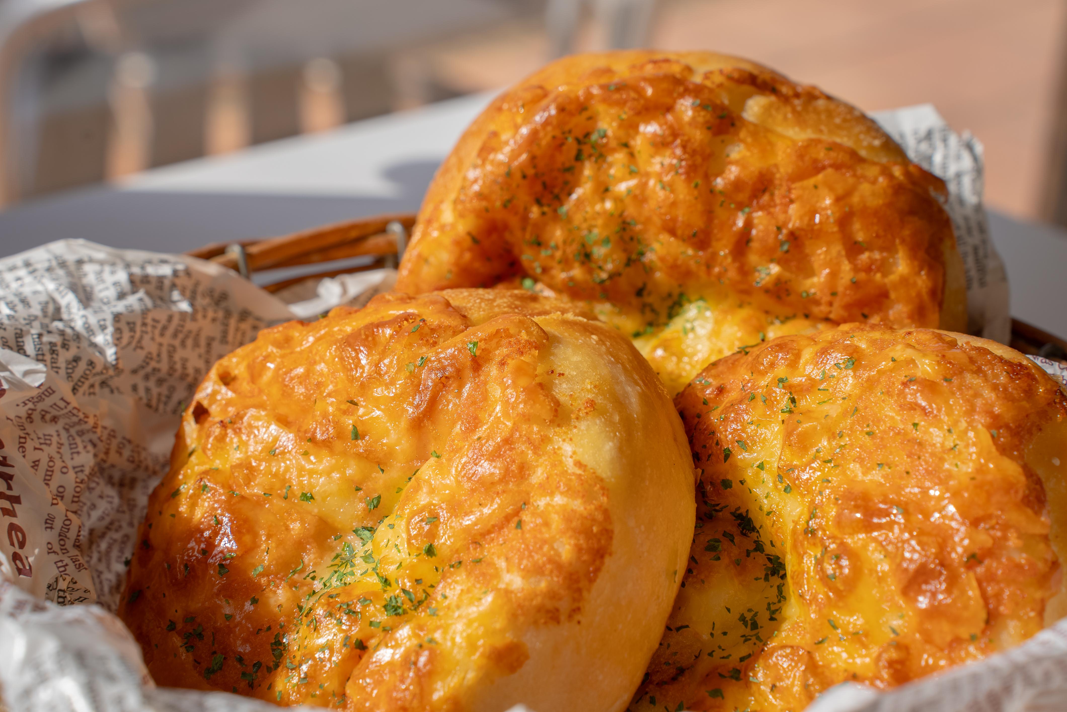 自家製明太子バターをたっぷりと包み、チーズをのせて焼き上げました!