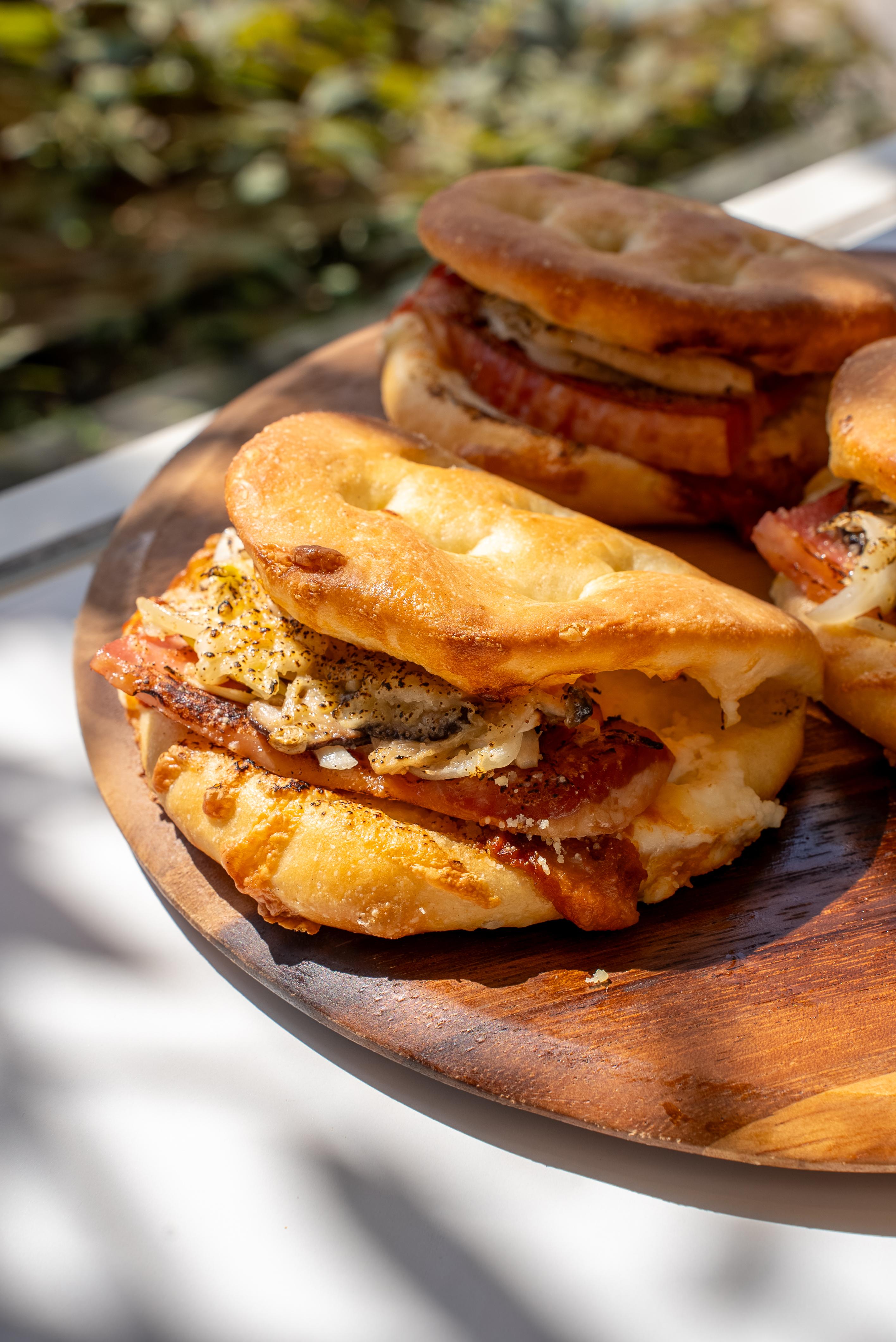 滋賀県産小麦”萬燈”を使用したフォカッチャに、厚切りベーコン、きのこ、自家製ベシャメルソース、ボロネーゼソースをサンドしました。